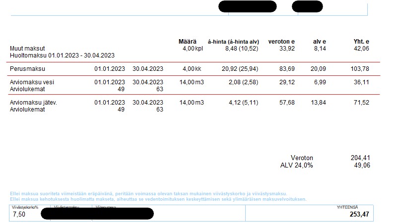 Laskulla näkyvä ”Muut maksut” on yhtä kuin huoltomaksu ja tämä on selitteenä seuraavalla rivillä. Kappalemäärä = laskutettujen kuukausien määrä.